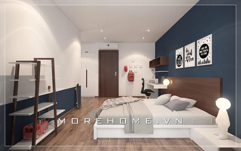 Thiết kế nội thất phòng ngủ bé trai hiện đại sử dụng tone màu xanh cá tính và năng động tạo nên nét độc đáo và mới lạ tại căn hộ chung cư