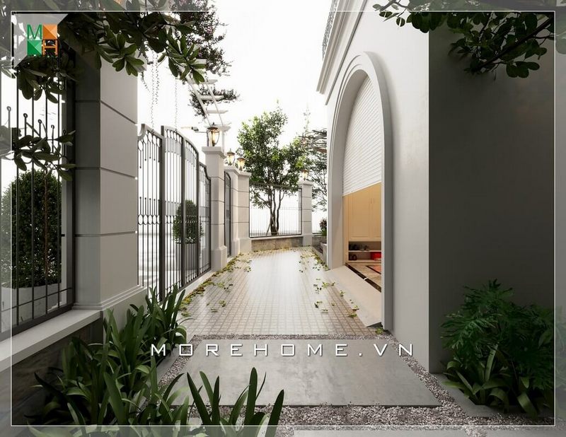 Thiết kế không gian lối đi hông nhà biệt thự đẹp và ấn tượng với hàng cây xanh mát đầy sức sống.