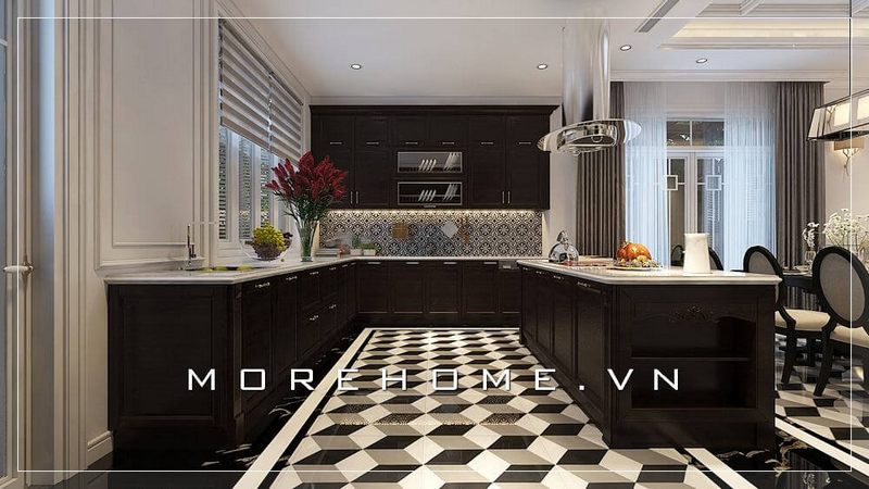 Thiết kế phòng bếp biệt thự sang trọng với nội thất tone màu nâu trầm mang đến không gian ấm cúng và sang trọng
