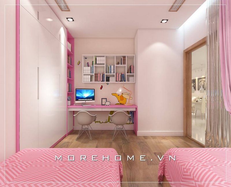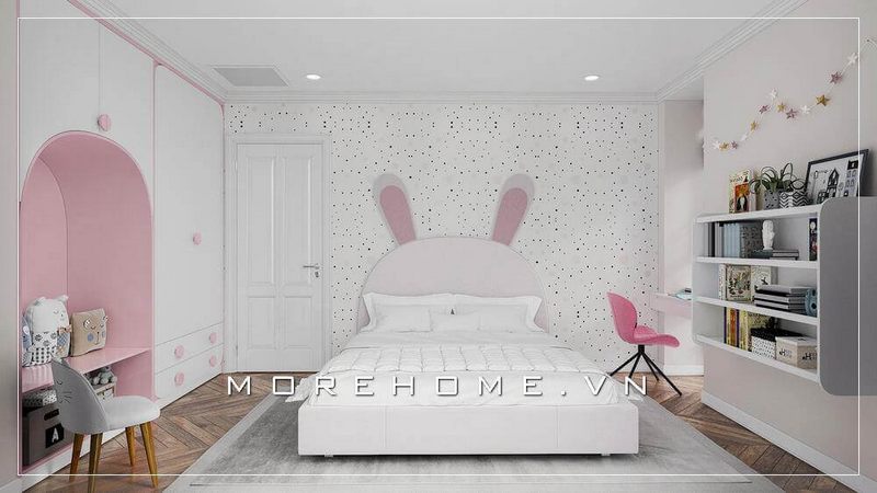 Tủ quần áo gỗ công nghiệp âm tường, tone màu trắng nhã nhặn kết hợp màu hồng nhẹ nhàng mang đến không gian phòng ngủ con thêm đẹp mắt, dễ thương hơn