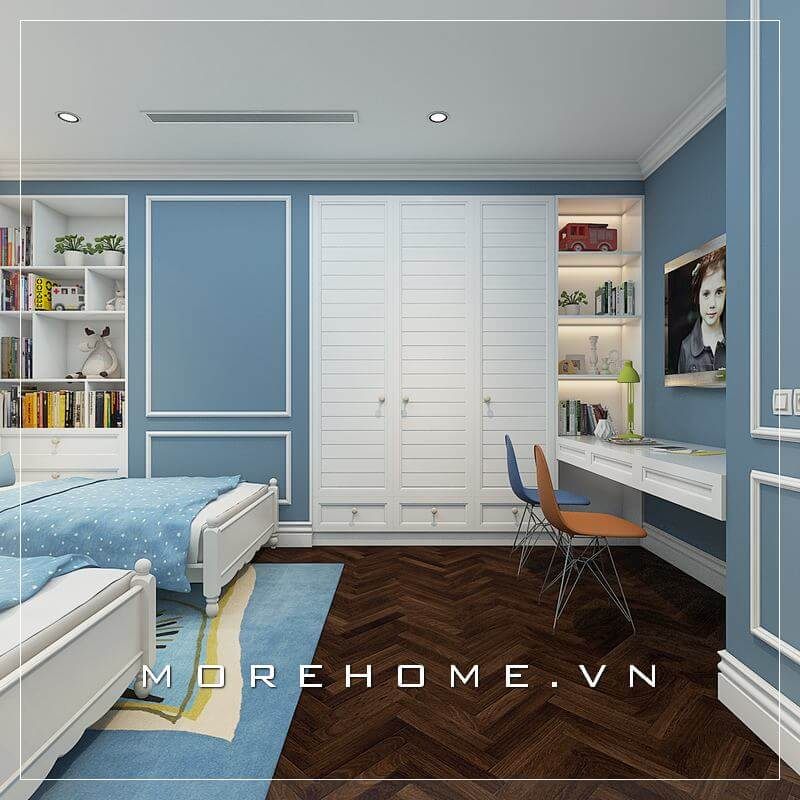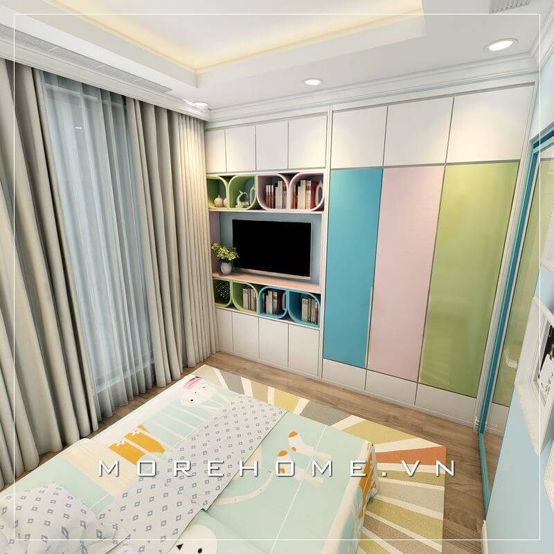Tủ quần áo trẻ em với lối thiết kế hiện đại, được tích hợp với kệ ti vi là ý tưởng hoàn hảo của gia chủ trong mẫu thiết kế này