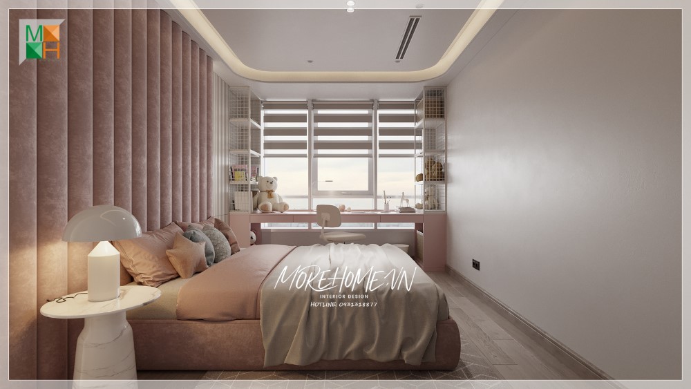 Nệm ốp tường đầu giường màu hồng nhạt tạo điểm nhấn riêng, sử dụng thoải mái tiện nghi có thể ngồi tựa trò truyện, đọc sách mà không bị đau mỏi