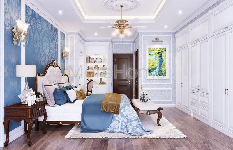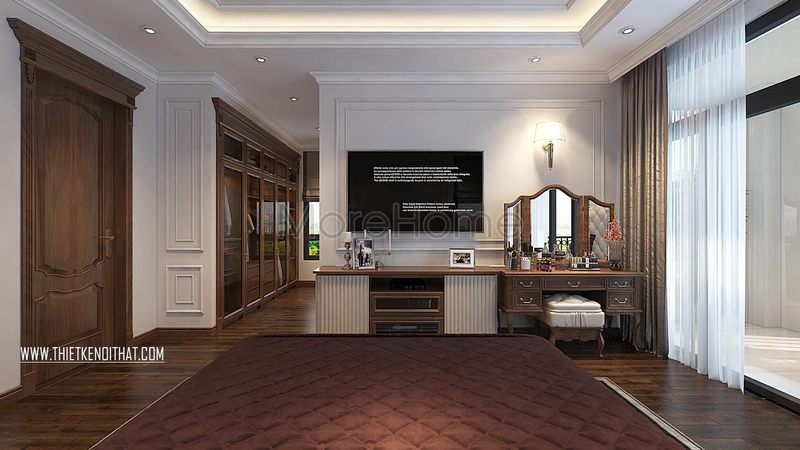 Cửa gỗ óc chó hiện đại có chất lượng cao và đẹp mắt, làm cho không gian phòng ngủ biệt thự hà nội trở nên bền vững.